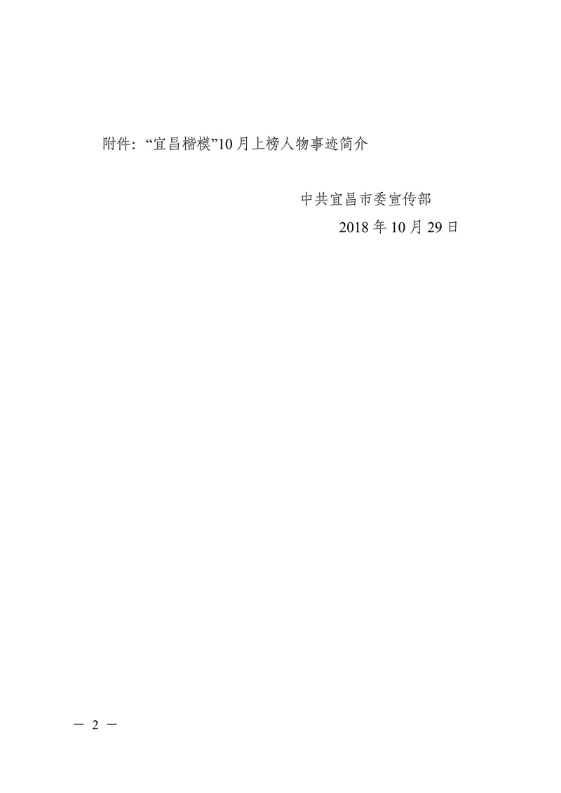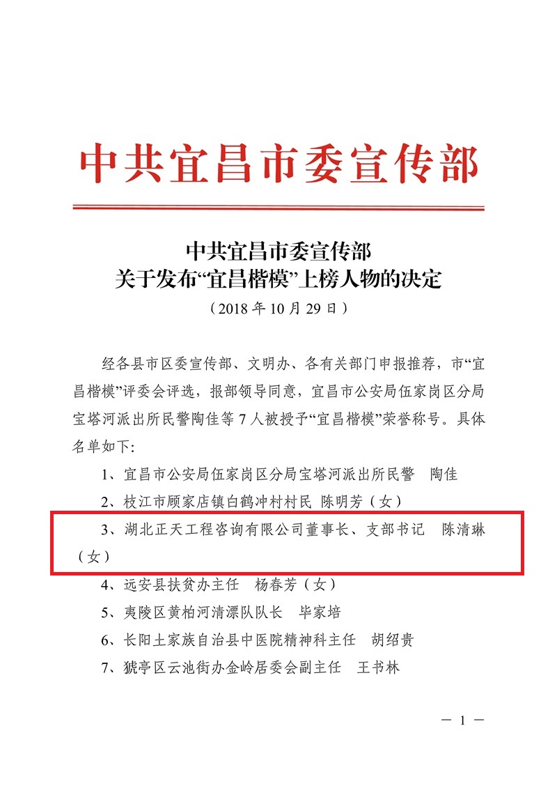 2018年10月29日,经宜昌各县市区委宣传部、文明办、各有关部门申报推荐,市“宜昌楷模”评委会评选,中共宜昌市委宣传部授予陈清琳同志“宜昌楷模”荣誉称号。