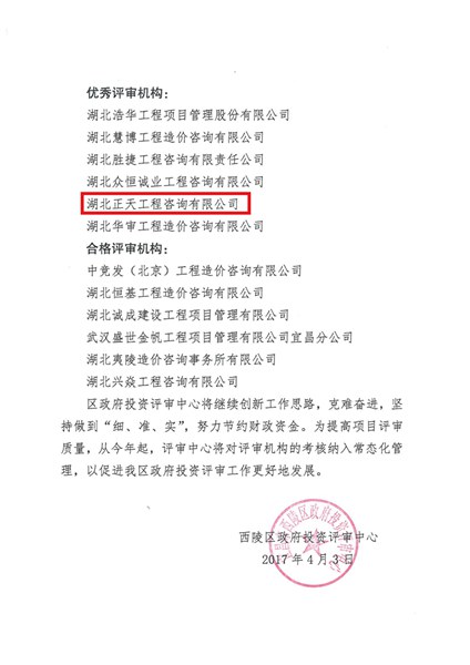 西陵区投资评审中心2016年度优秀评审机构表彰