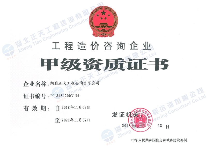 工程造价咨询甲级资质证书