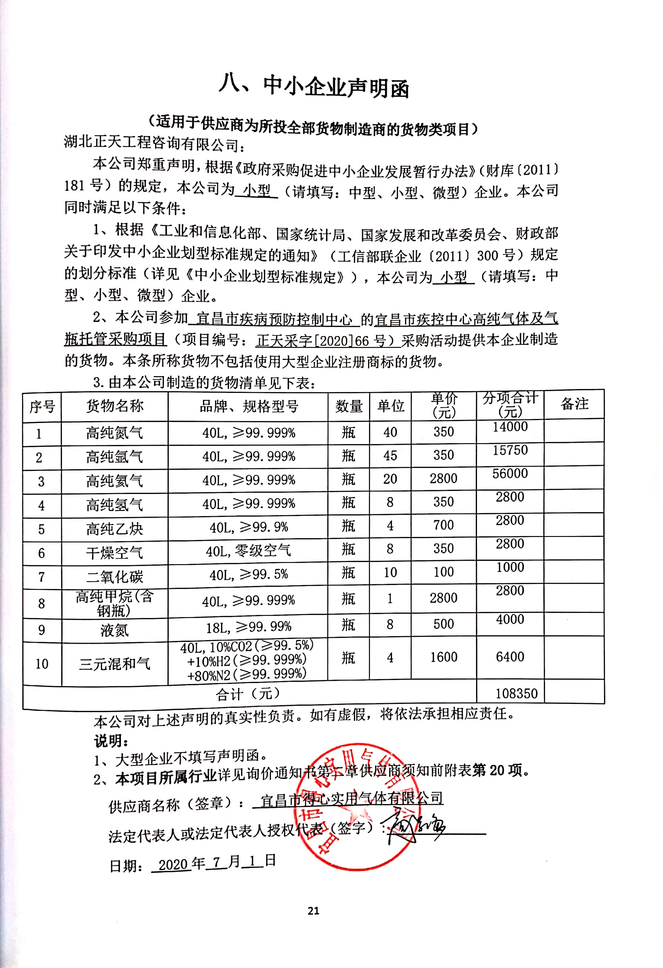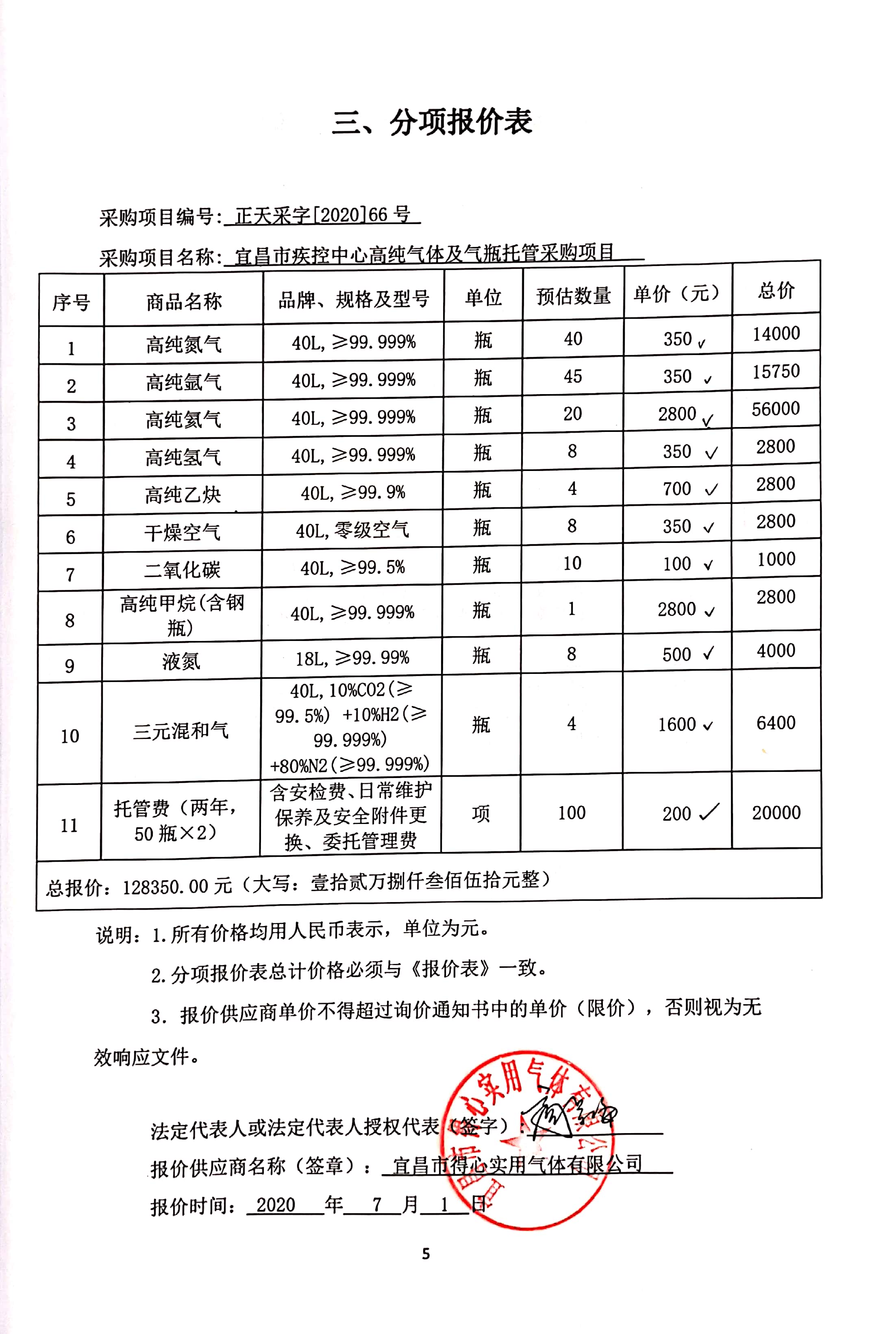 名称:宜昌市疾控中心高纯气体采购及气瓶托管服务 交货地点:宜昌市疾病预防控制中心 服务期:合同签订之日起至2022年6月31日 品牌、规格型号、数量、单价:详见附件 |